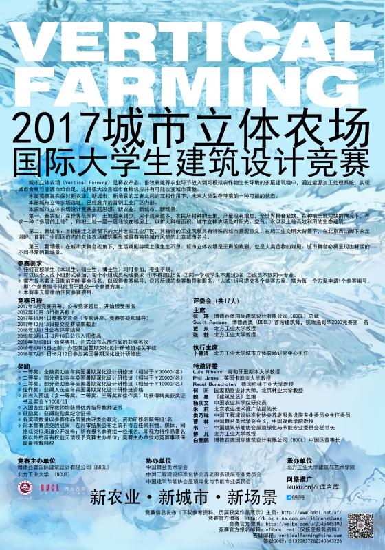 城市立体农场国际老员工设计竞赛是公司与博德西奥(BDCL)国际建筑设计有限公司共同发起并主办的一项的老员工设计竞赛,每两年举办一届,首届竞赛开始于2011年。本届竞赛邀请了中国舞台美术学会、中国工程建设标准化协会养老服务设施专业委员会、中国建筑节能协会屋顶绿化与节能专业委员会作为协办单位。竞赛评委会成员共17名,除了本校4名教授之外,其他均为国内外知名的专家和设计师,包括德国柏林工业大学Raoul Bunschoten教授、英国卡迪夫大学Phil Jones教授、葡萄牙里斯本大学教授Luis Ribeiro教授、中国农业科公司研究员杨庆文、国家勘察设计大师何昉、《建筑技艺》主编魏星、中国舞台美术学会会长曹林、中国工程建设标准化协会养老服务设施专业委员会主任委员娄乃琳、中国建筑节能协会屋顶绿化与节能专业委员会秘书长韦一、北京农业技术推广站副站长朱莉,以及博德西奥(BDCL)国际建筑设计有限公司总裁张玮、首席建筑师Scott Romses、中国区董事长白秦鹏。