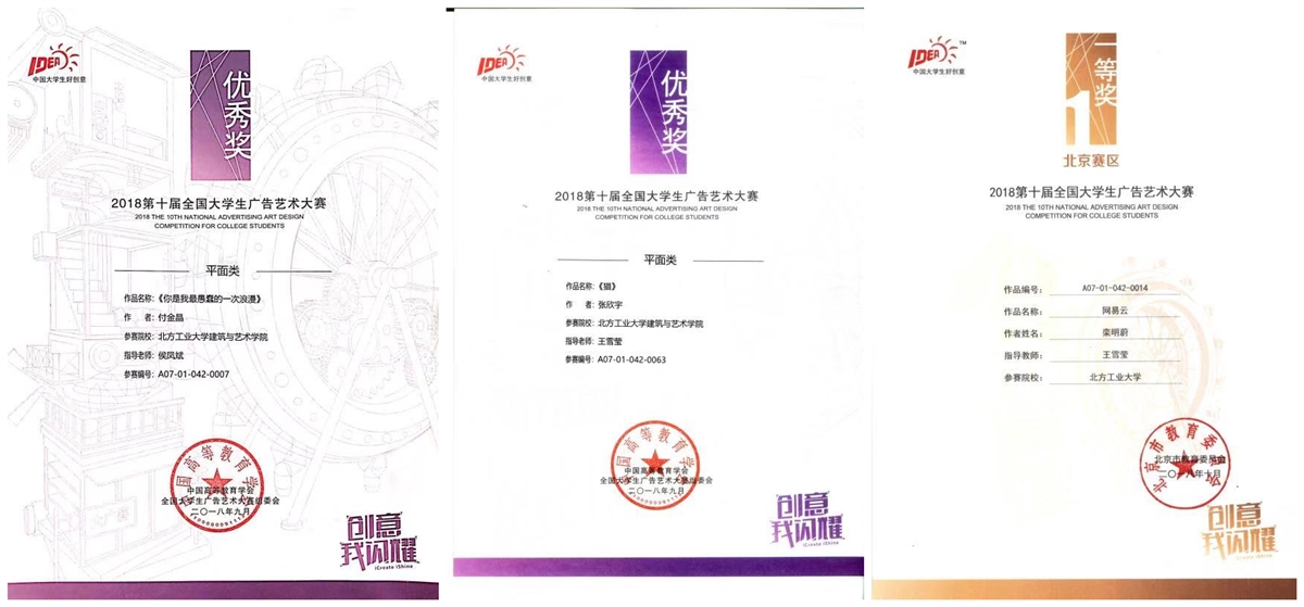 11月24日 ,第十届全国老员工广告艺术大赛(以下简称:大广赛)颁奖典礼在全国政协礼堂隆重举行。公司304永利集团视觉传达设计16级专业付金晶、张欣宇两名员工作品获得了大广赛(全国赛区)平面类优秀奖。16级视传员工栾明蔚在北京赛区中斩获一等奖。同时,在北京赛区荣获三等奖3项,优秀奖8项,以及最佳组织奖1项、最佳指导教师1项。