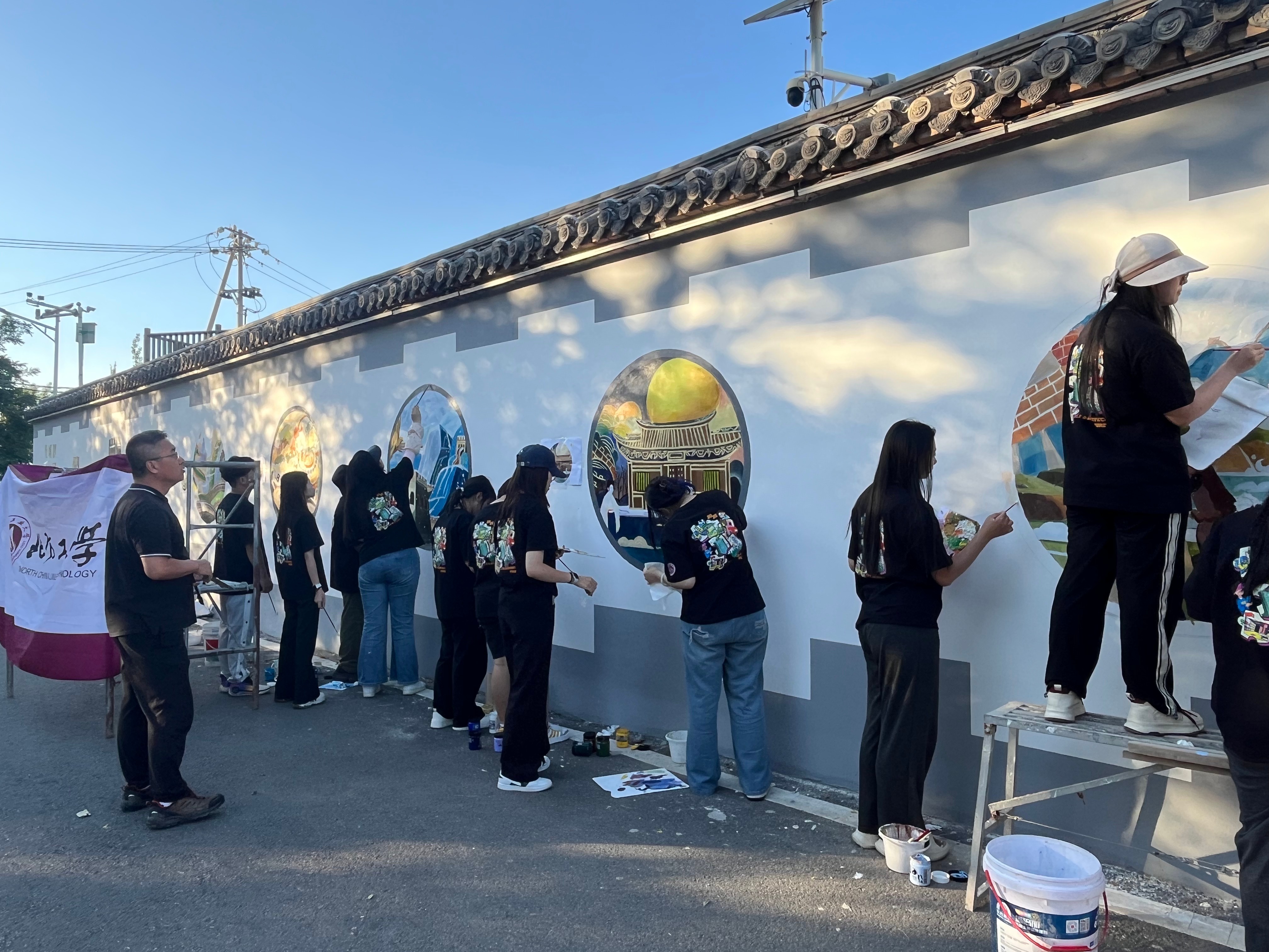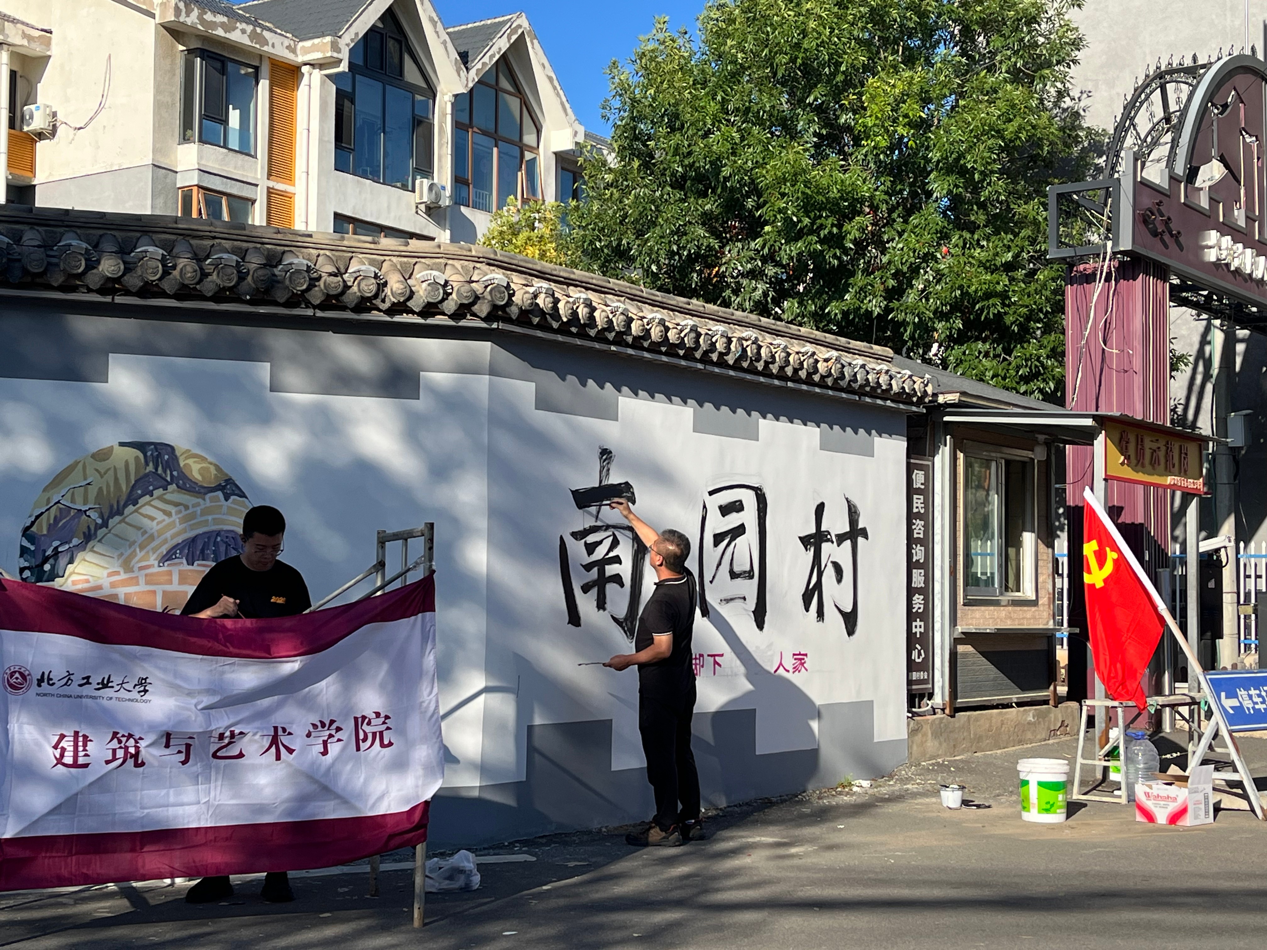 在创作过程中,同学们分工协作、互相配合。有的负责勾勒线条,有的专注上色,有的细心调和颜料。烈日下的挥汗、墙面上的涂抹,构成了一幅生动的劳动与艺术交织的画面。作为中国书法家协会资深会员的苏刚副教授更是担纲了墙画文字的书写,正楷手写的“南园村”三个字成为整个入村墙面视觉提升的点睛神来之笔。
