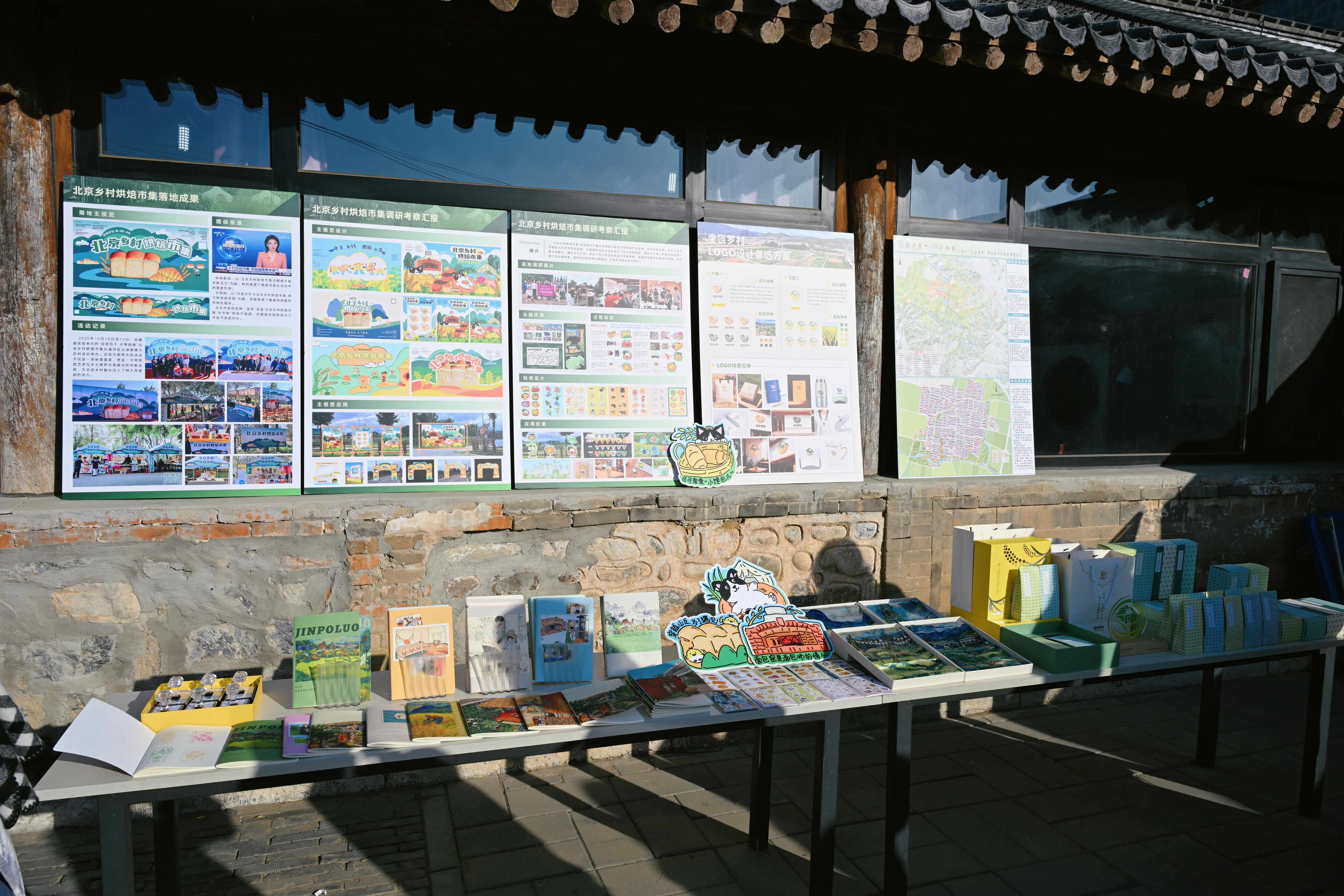 依托金叵罗村深厚的生态本底与丰富的农旅资源,深入调研农场、民宿、村民住宅等多元场景,开展系统性设计实践。规划紧扣“低碳艺术,融入乡村”的核心思路,聚焦村内四大关键节点进行艺术化改造,打造出“碳艺暖剧场”等公共空间,围绕生产、生活、生态三大主题规划游览路径,有机串联农场、民宿、市集与河岸景观,促进农文旅深度融合,着力塑造主客共享、活力永续的乡村典范。以本地特产“金黄小米”为核心灵感,设计了兼具文化内涵与现代美感的农产品包装及系列文创衍生品;同时,融合密云地貌与乡土风物,创作出一组独具特色的烘焙主题IP形象,显著增强乡村产品的叙事张力与品牌识别度。