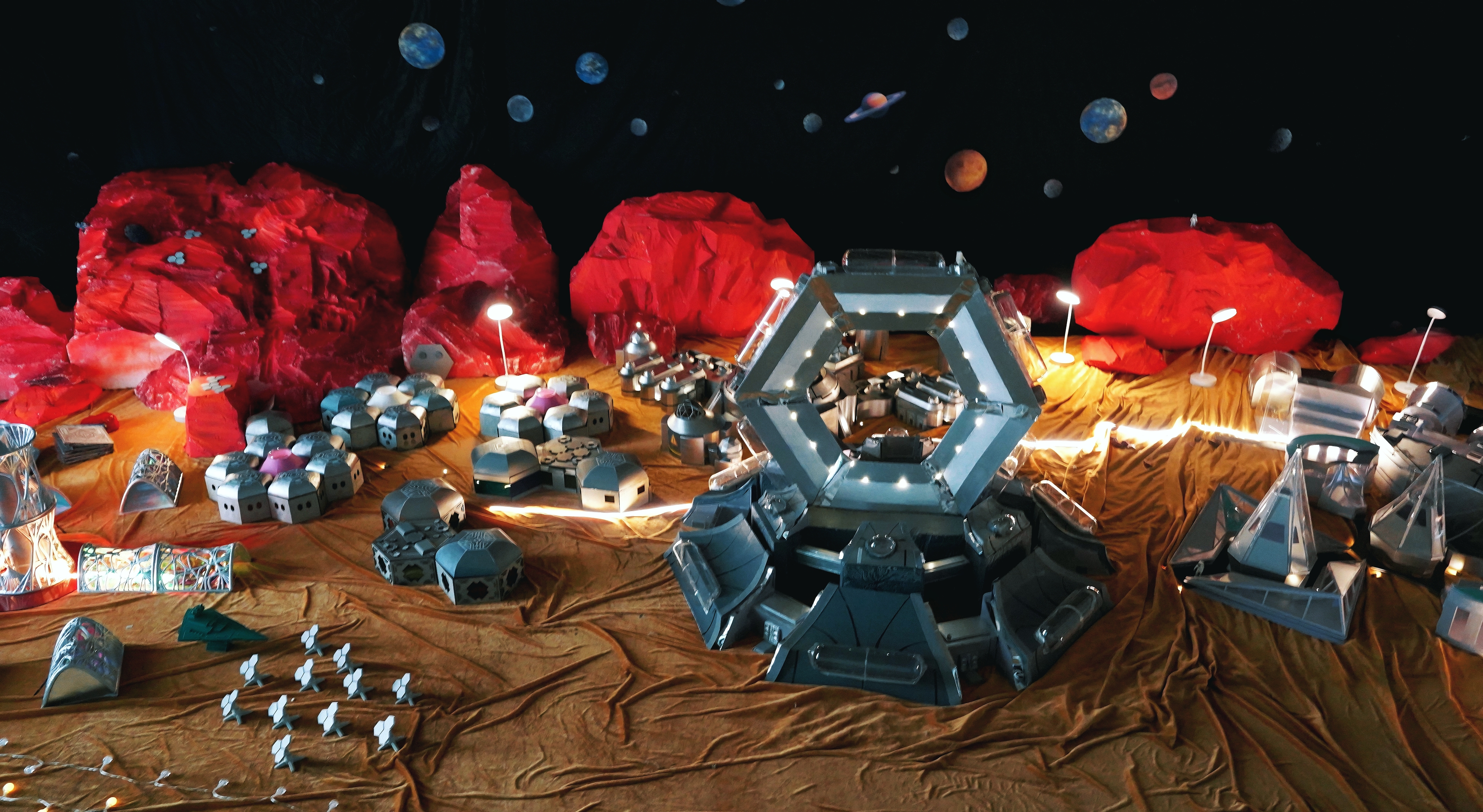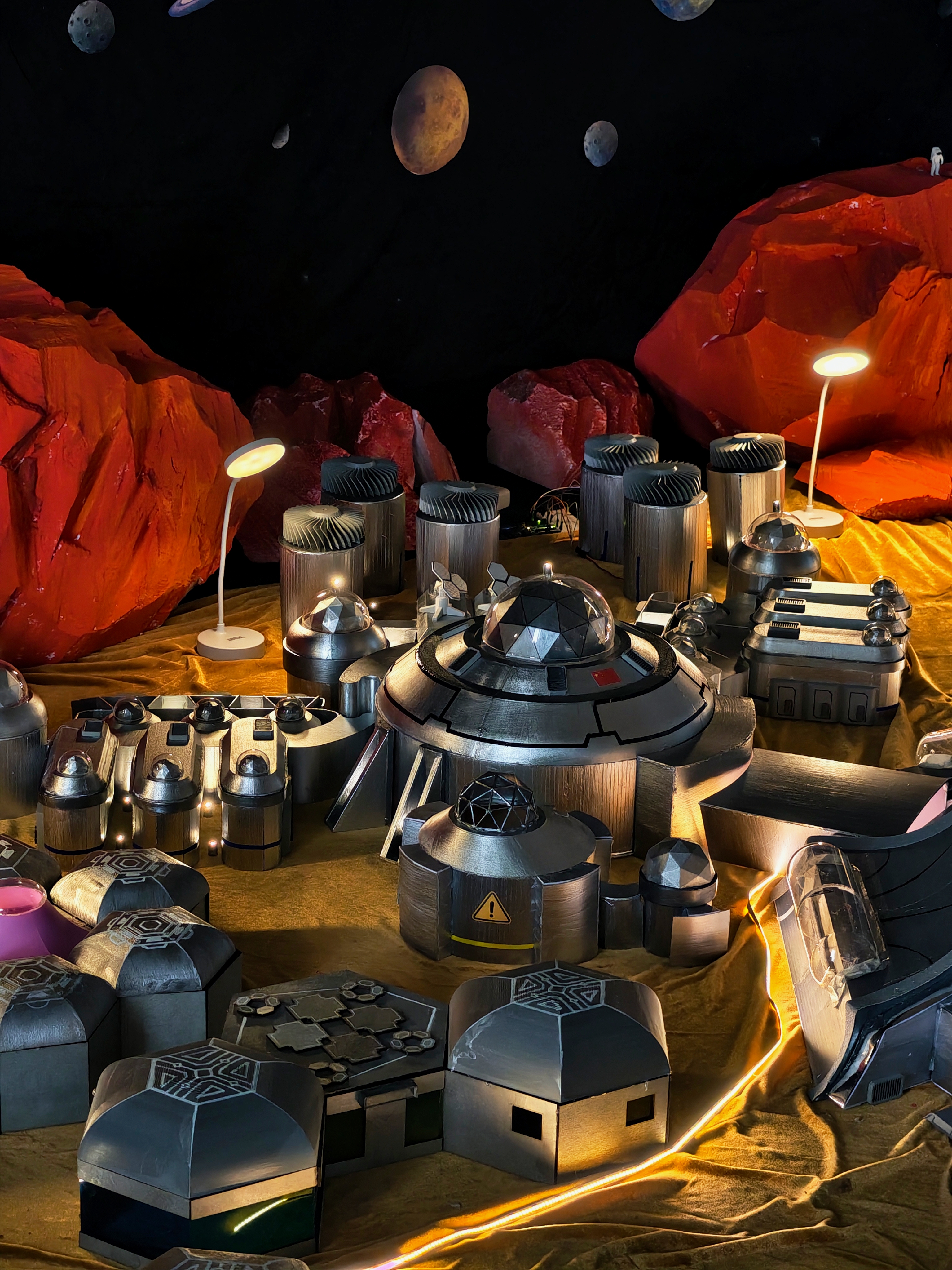 本次展览的重磅作品之一,便是由员工团队完成的“火星基地2026”大型概念模型。这不是一个简单的建筑模型,而是一座微缩的“火星城市”。基地以构建火星可持续社区为设计蓝本,集成了中控指挥、住宅生活、生态循环、物资运输、科研能源及可扩展舱段六大功能模块。中控区统筹全局数据与应急响应;住宅区运用多层防护材料营造宜居环境;生态区通过受控环境农业实现食物自给与氧气再生;能源区依托风能与太阳能互补系统,实现能源自循环。更吸引人的是,这个基地会“动”——模型启动后,贯穿基地内外的LED灯带将按预设程序变幻光效,勾勒各功能区轮廓;太空舱区的柔性气囊会定时充气展开,模拟双稳态结构的动态特性。灯光与机械的协同运行,生动呈现未来火星基地的智能化运行与生态自循环状态。设计背后,是员工对“再造家园”的思考。突破单一生存视角,构建一个具备生命支持、生产制造与社会功能的微型城市雏形,展现人类在外星球上通过科技与自然共生、缔造可持续文明的可能性。模型采用雪弗板手工切割与3D打印制作主体,结合亚克力透明罩展示内部结构,激光切割木板制作框架与地形,TPU柔性气囊模拟可充气舱段,LED灯带贯穿内外——每一处细节,都凝结着员工对技术、空间与未来的探索。