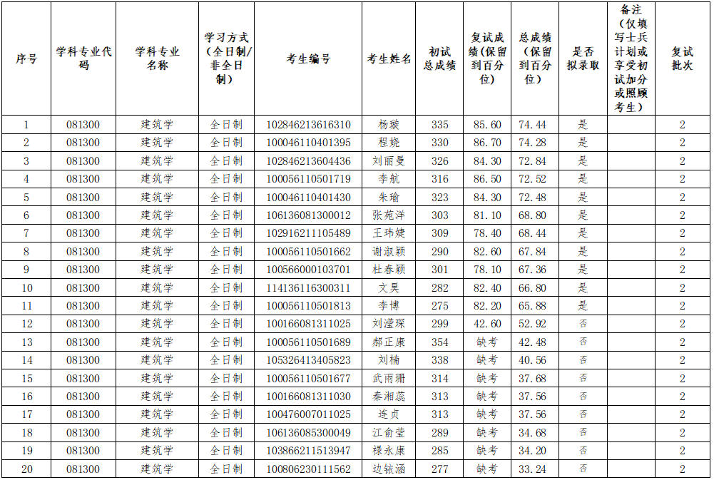 2026年建筑学(081300)第二批次拟录取名单(01建筑设计及其理论方向 )公示如下:
